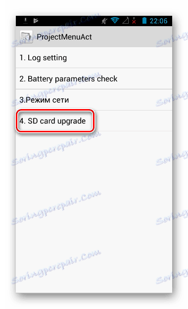 *#*#1673495#*#* у инжењерски мени, *#*#1673495#*#* у бројчаник: *#*#1673495#*#* . Након отварања менија изаберите "СД цард упграде" .